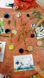 Pour préparer ce travail de fresque, les enfants ont expérimenté (au cours d’ateliers successifs, différentes façons de représenter la végétation, s’interrogeant sur les mouvements des plantes sous l’effet du vent, et sur leurs couleurs.