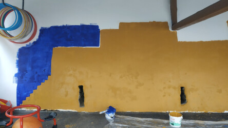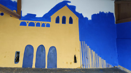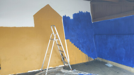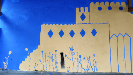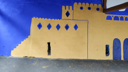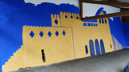 Les enfants ont d’abord tracé la silhouette du château sur un tableau, que j’ai reportée sur le mur, puis, aidés de leurs parents, les enfants ont commencé la mise en couleur (nous nous sommes occupés de la partie haute avec l’enseignante). Le lendemain, les enfants ont proposé des formes d’ouvertures ainsi que leur disposition. Un par un, ils ont ensuite travaillé la végétation.