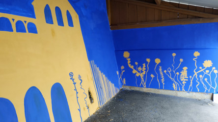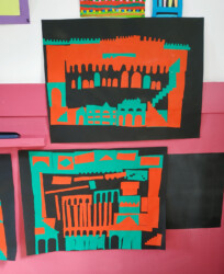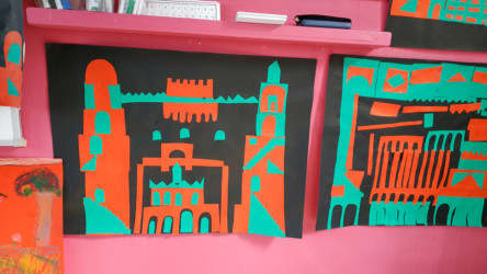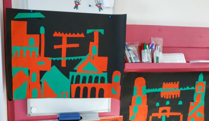 Lors de ce projet, j’ai accompagné les enfants dans la réalisation d’une fresque inspirée du patrimoine local et du fruit d’expériences graphiques diverses.
