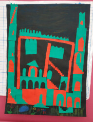Nous avons aussi fait plusieurs « jeux de construction » sous forme de collages au cours desquels les enfants ont réinterprété le château de Promenois qui nous a servi de point de départ pour ce travail, en énumérant les éléments architecturaux qui le caractérisent.