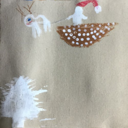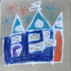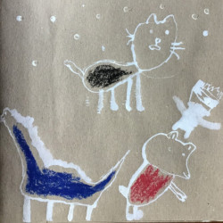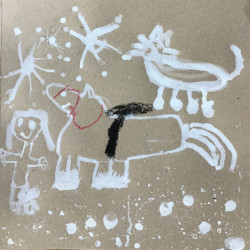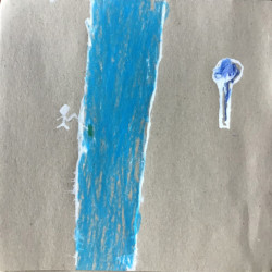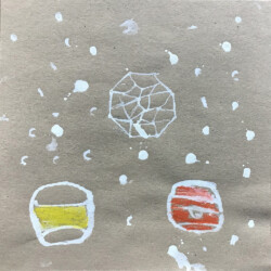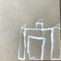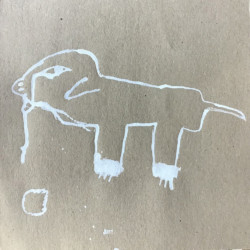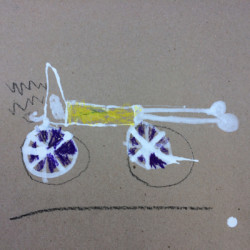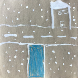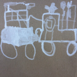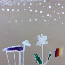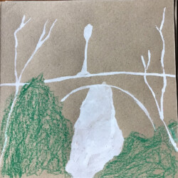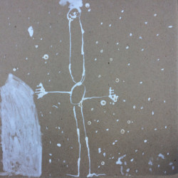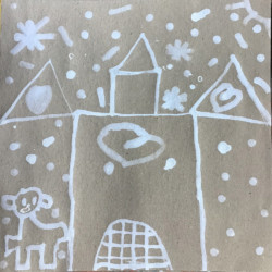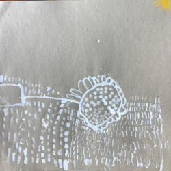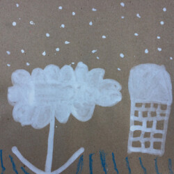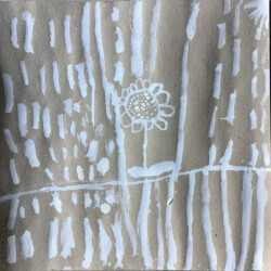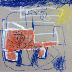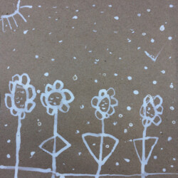 Recherches graphiques à l’aide d’outils inhabituels (calame, branchette, coton-tige) trempés dans l’encre, réhaussée avec des pastels gras.
