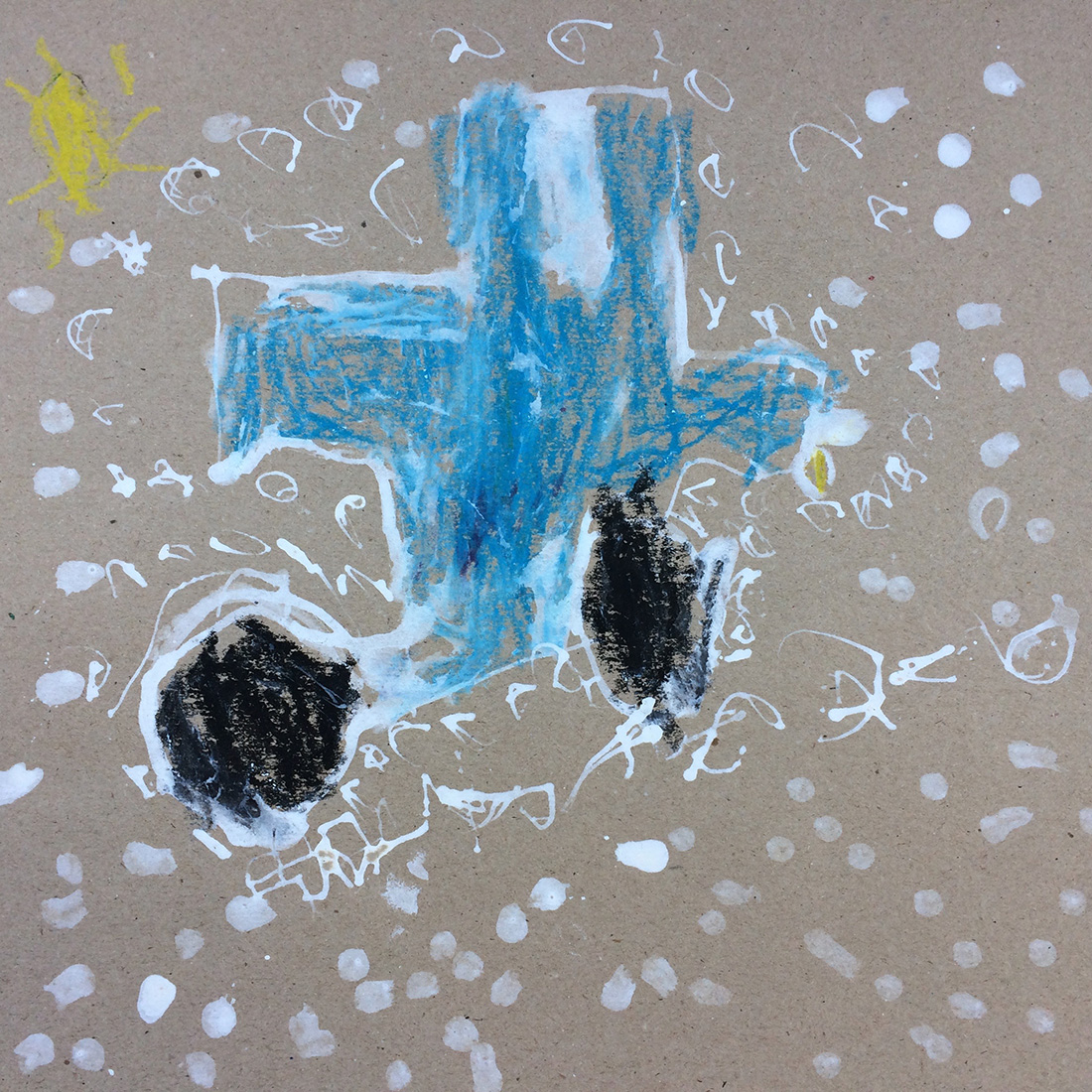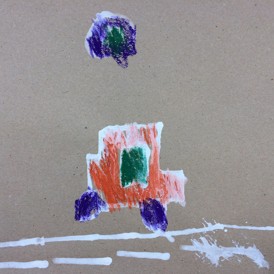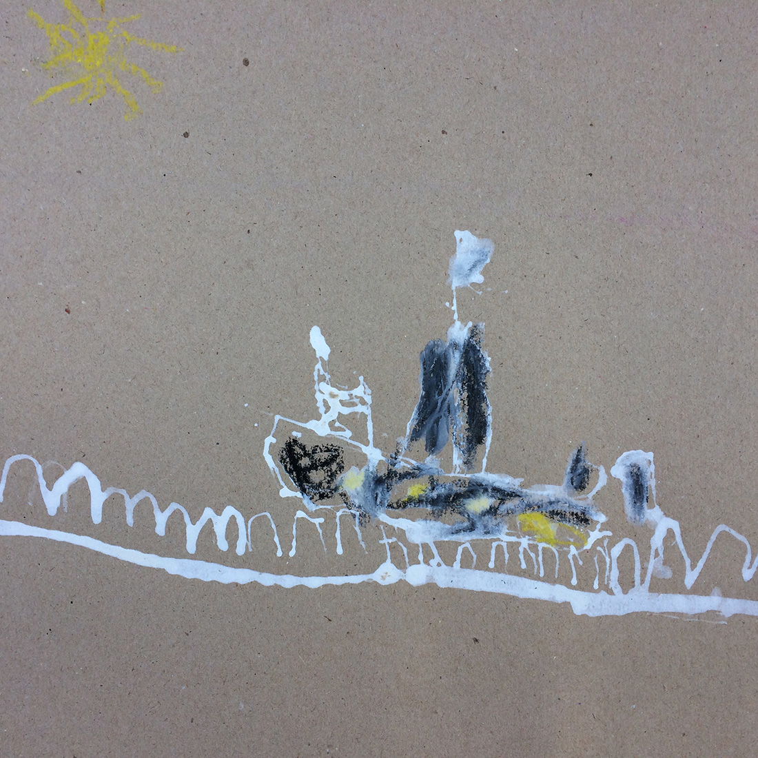 Recherches graphiques à l’aide d’outils inhabituels (calame, branchette, coton-tige) trempés dans l’encre, réhaussée avec des pastels gras.