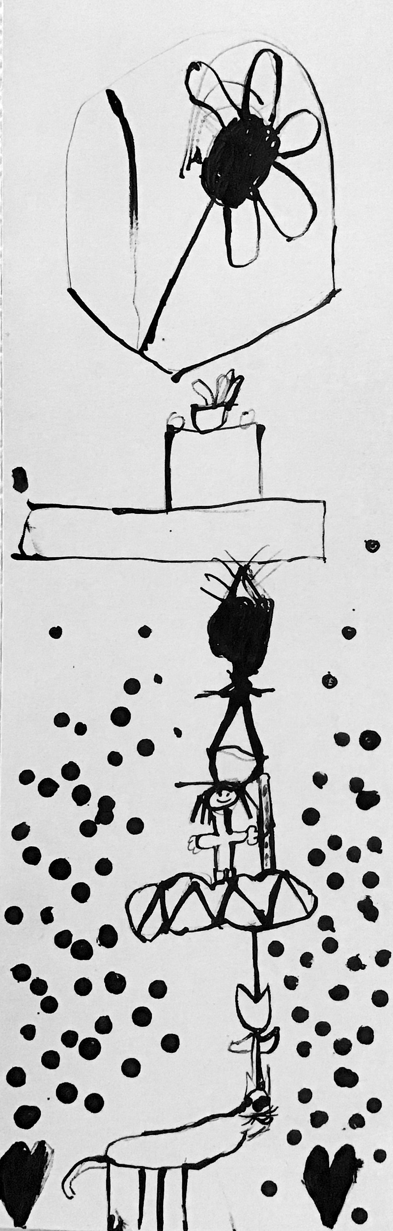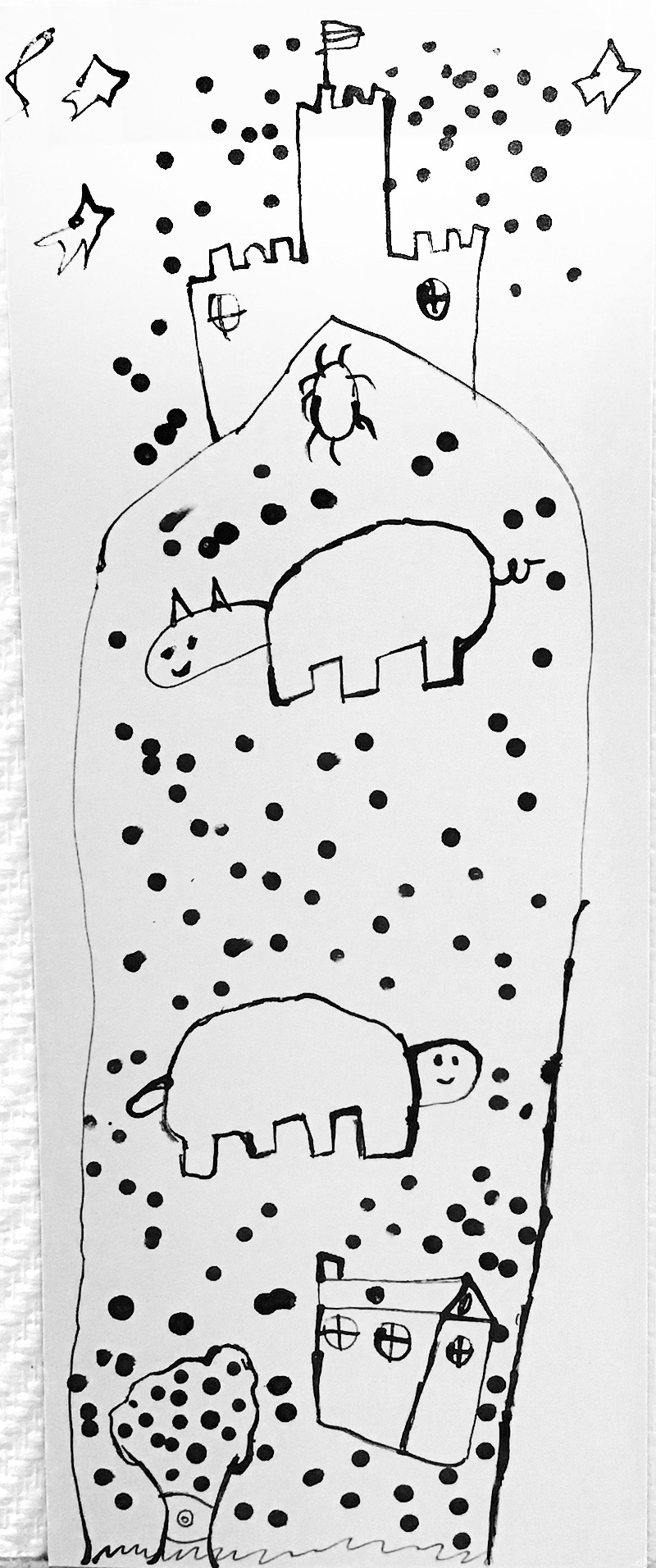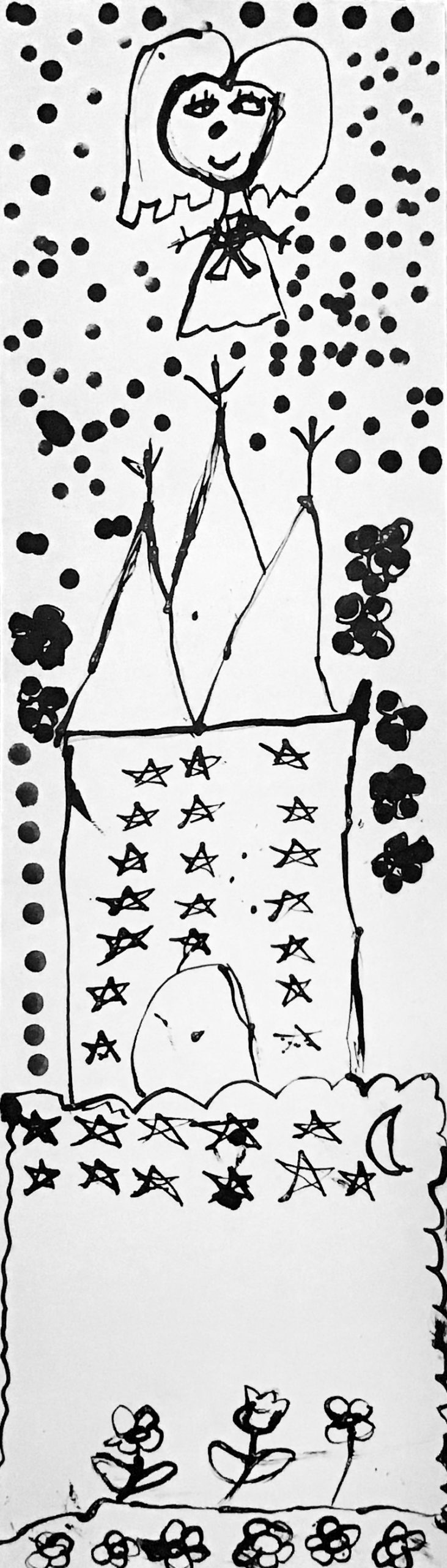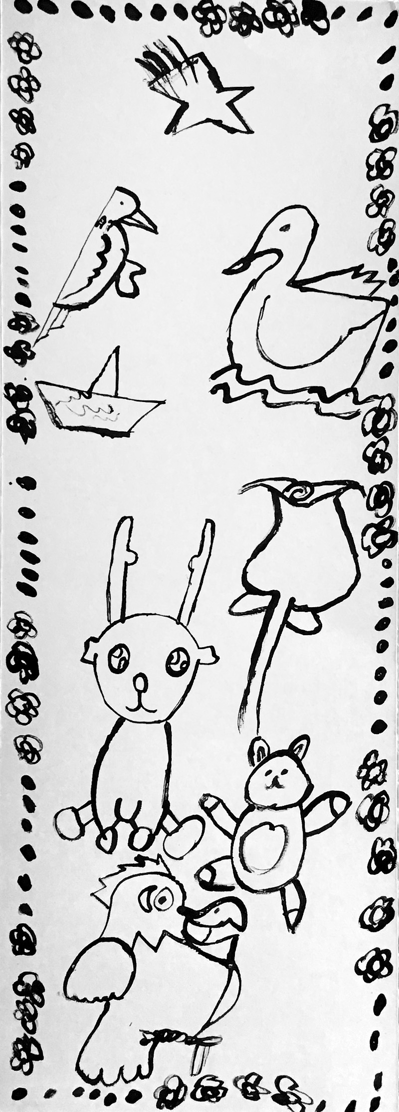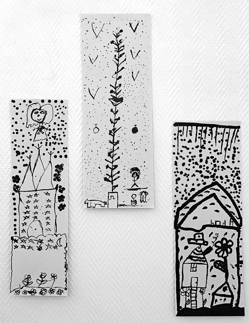 Lors de cet atelier, à l’aide d’outils inhabituels tel que des coton-tiges, des cures dents ou des calames, les enfants ont dessiné leur propre totem composé de ce qui les représente et ce qui leur tient à cœur. Pour les guider, je leur ai proposé de travailler à la façon d’un portrait chinois.