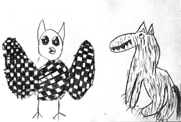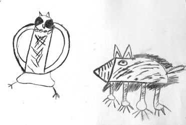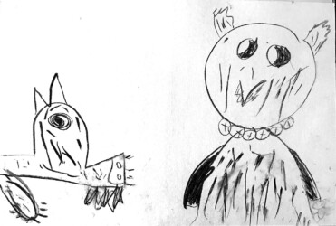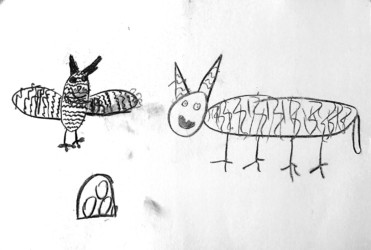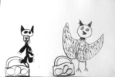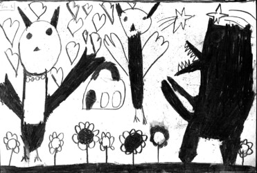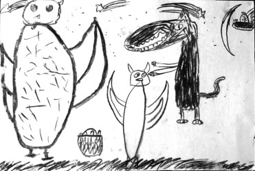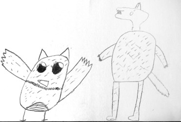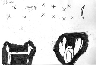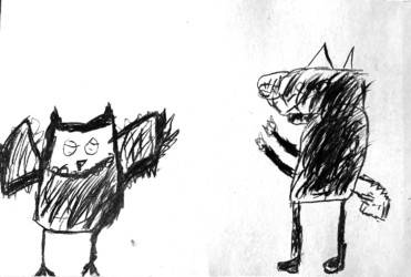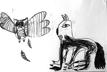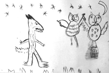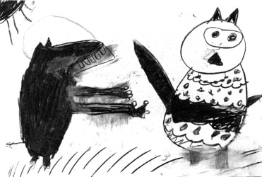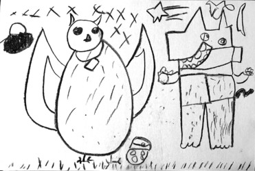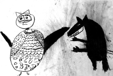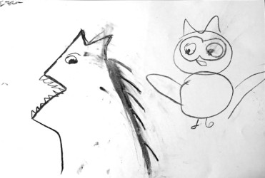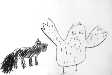 Une seule image au fusain pour traduire une rencontre du loup et de la chouette. Les enfants ont d’abord choisi quelle rencontre illustrer, choisi les attitudes puis réfléchi à l’organisation des personnages dans la page pour transcrire le plus fidèlement ce moment de l’histoire.